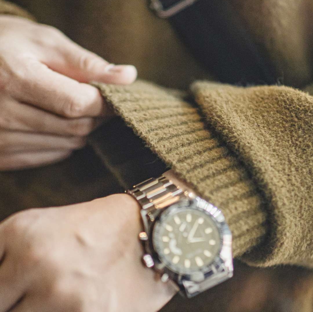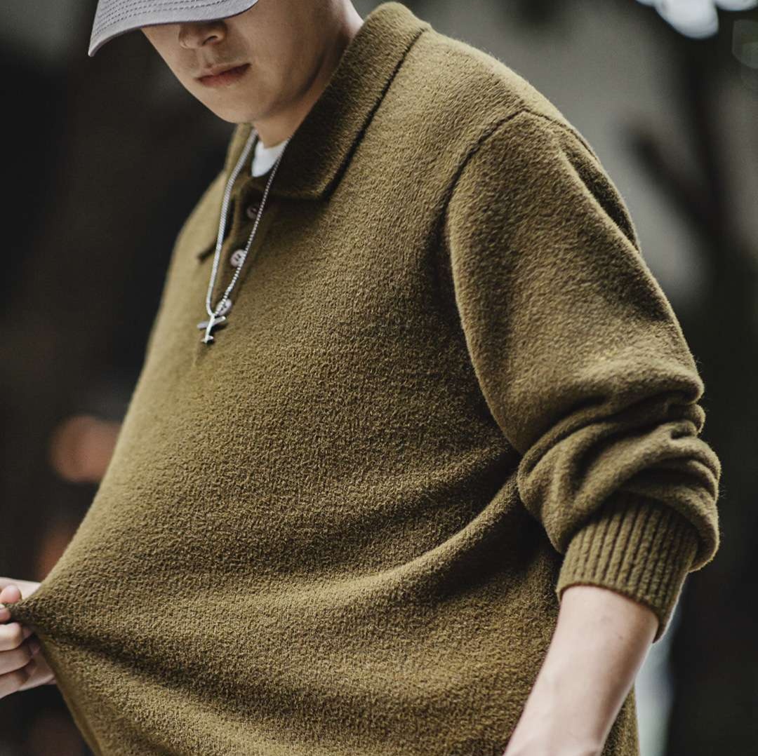 伝統的なポロシャツの襟元とニット素材の組み合わせで落ち着いた大人の雰囲気を演出
