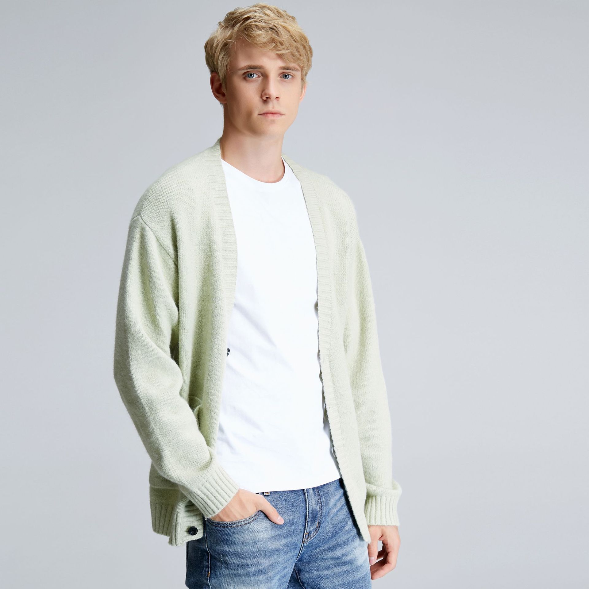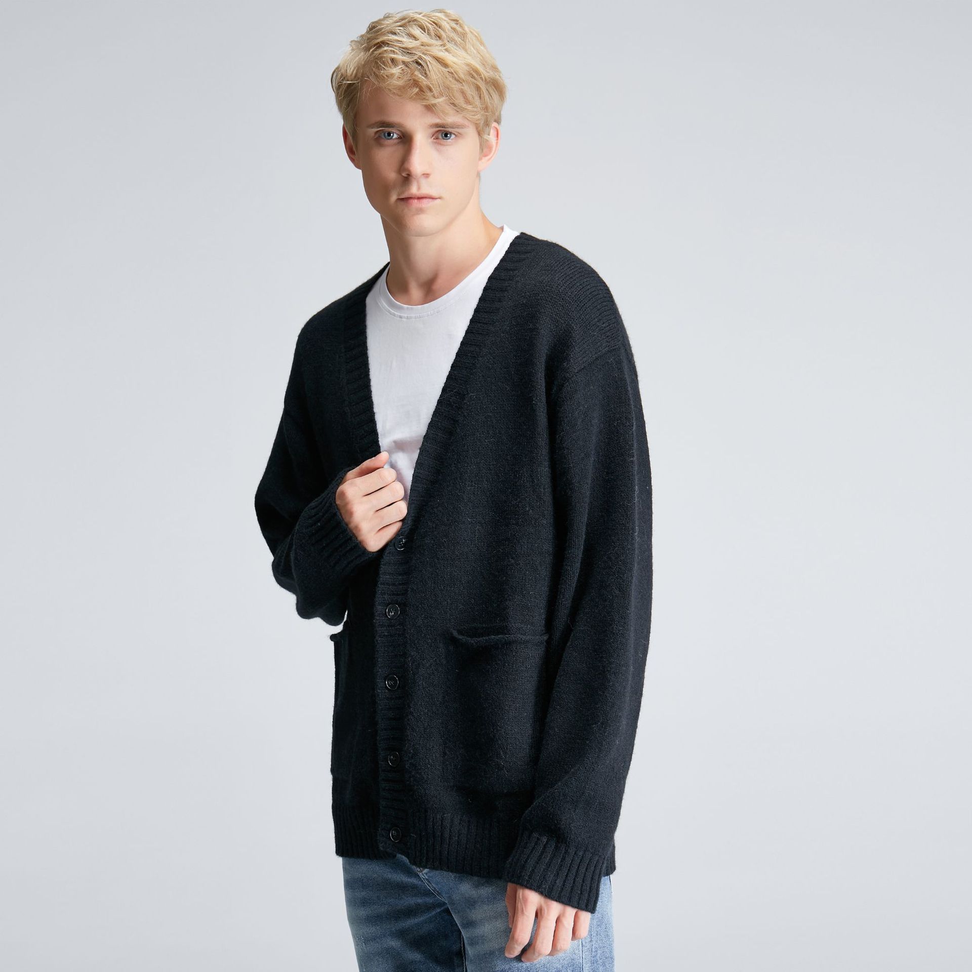 深めのブイネックデザインが特徴的なメンズ カーディガンです。